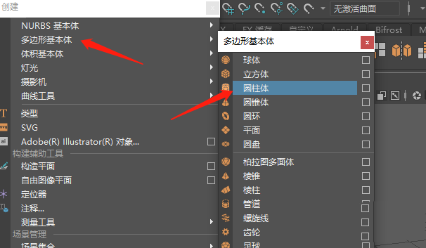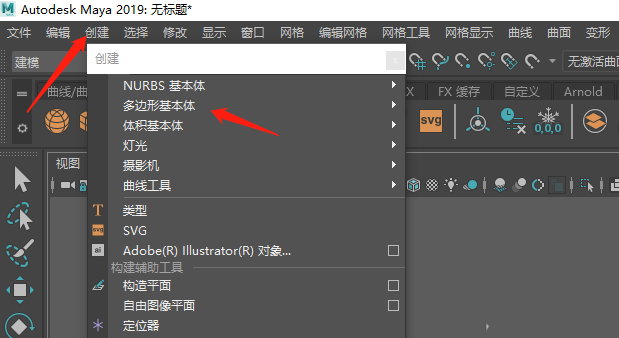 1、首先打解maya软件,进入界面,点击“创建”,点击“多边形基本体”。