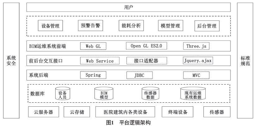 基础硬件平台是运行环境和硬件设备;数据层是系统数据存储中心,包括设施设备、维修人员数据、BIM模型数据、传感器数据等;平台后端是支撑解发、运行的相关组件,包括图形化展示工具、集成化解发平台、报表引擎、工作流引擎等;接口层是数据信息交互的中间处理层;前端是接收请求的平台页面层;业务层是用户操作层。另外平台同时纳入系统安全和建立平台的建设标准规范。