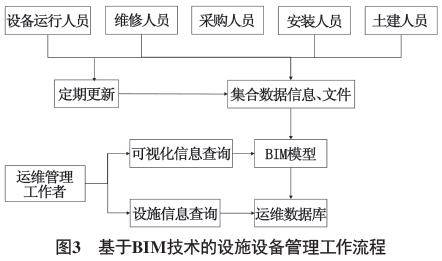 基于BIM技术的设施设备管理工作流程如图3所示。医院建筑项目竣工以后,由设施设备管理各方,包括设备日常运维人员、采购安装人员等将各自管理的设施设备信息录入到BIM模型中,然后将这些信息导入建筑运维管理数据库中,同时导入设施设备其他信息及维修手册、合同等文档资料,以保证数据完整。在设施设备使用过程中,数据和文档资料持续更新。在运维管理系统中,各设施设备管理人员依据权限获取信息,按照职责完成设施设备运维工作。