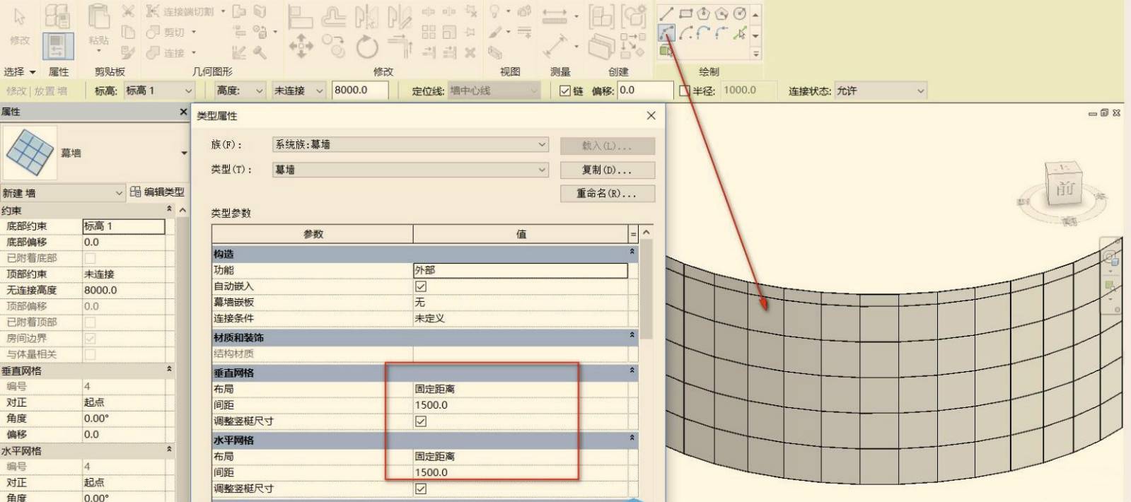 先通过利用起点终点半径弧工具绘制一个弧形的幕墙,打开属性面板,将网格设置布局设置成固定距离。
