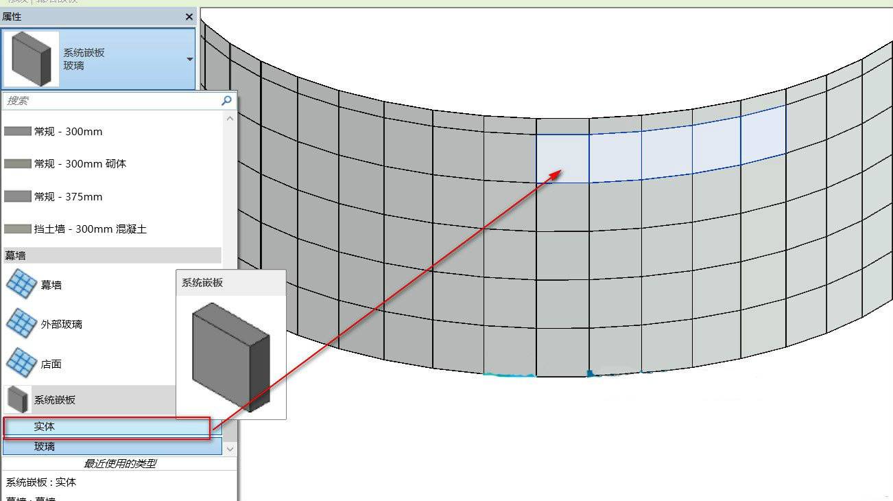 再利用tab键选中幕墙网格,通过属性面板下拉,可以找到一个实体的替换,可以根据自己的需要选中要改成实体的网格,只留下部分幕墙就可以。