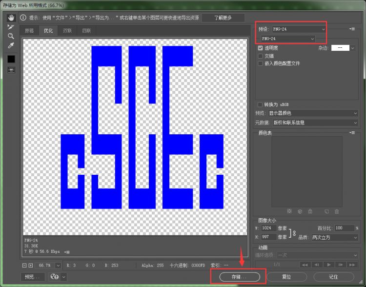 Ctrl Shift Alt进入存储为Web所用格式对话框,预设为PNG-24(支持透明通道),点击存储,选择保存路径,如图所示。