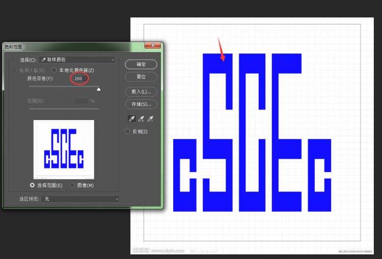 在菜单栏中找到-选择-色彩范围,鼠标移到图片蓝色区域单击,即可取样到蓝色部分,颜色容差200(可调),确定,如图所示。