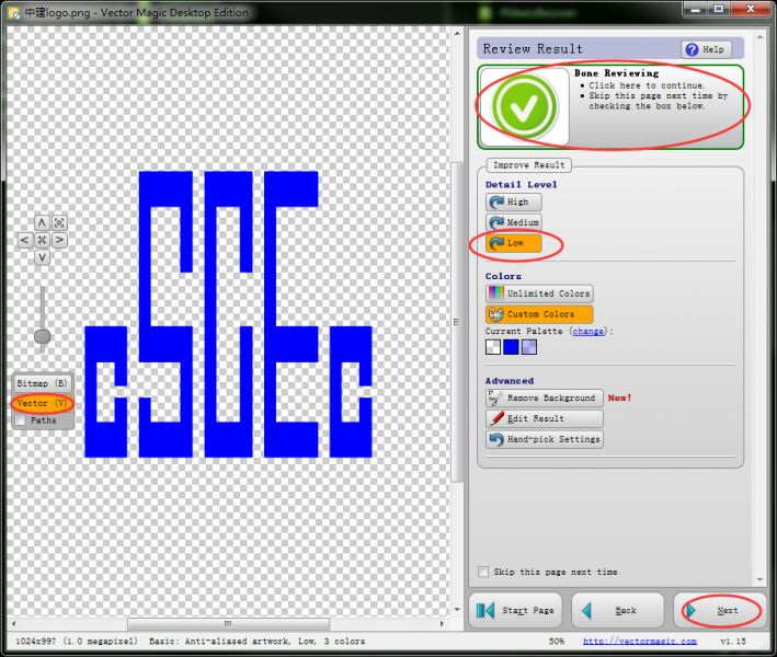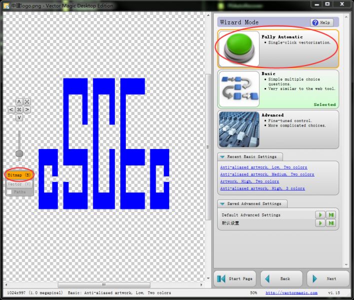 下载Vector Magic软件(位图转矢量图),打开软件,拖入上一步中制作好的图片,然后点击Fully Automatic(全自动),也可以使用高级功能,根据实际情况而定,这里选择全自动就可以。软件计算完成后,可以看到左侧,黄色块从Bitmap(位图)上转移到了Vector(矢量),说明图片已经转换成了矢量图,Detail Level(细分级别)可以自行调整,这里选择low(低),如图所示。