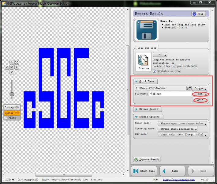 点击Next(下一步),到达保存结果界面,在Quick Save(快存)选项卡中设置保存路径,名称以及保存格式,这里选择dxf格式,点击Save保存,如图所示。