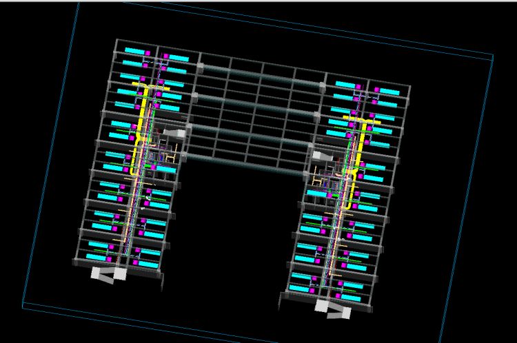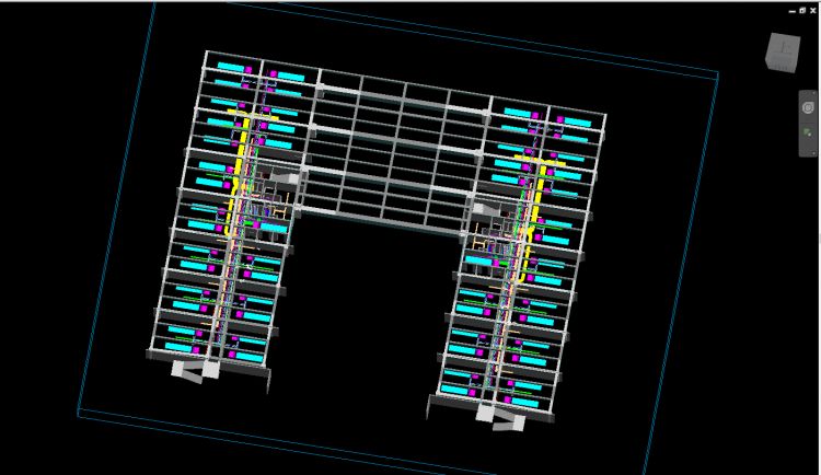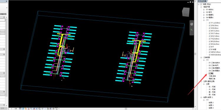 BIM模型搭建完成后,一般需要在三维展示。展示要有侧重点,比如侧重机电管线、侧重空调系统,或者只是展示某一个比较复杂的机房,一般的方式就是通过剖面框将需要展示部分框出来并单独保存一个视图,如图所示。