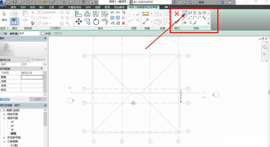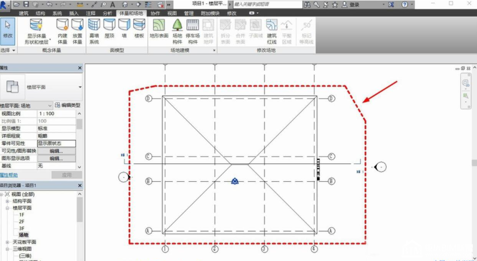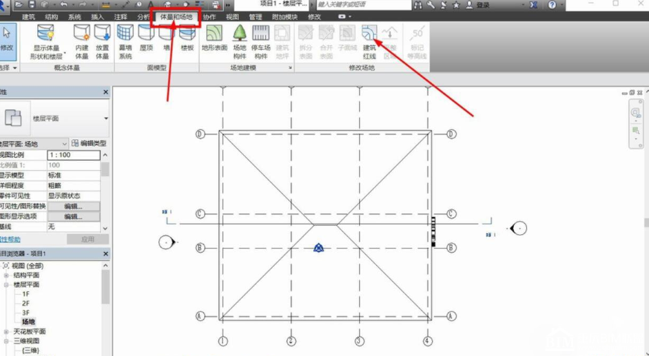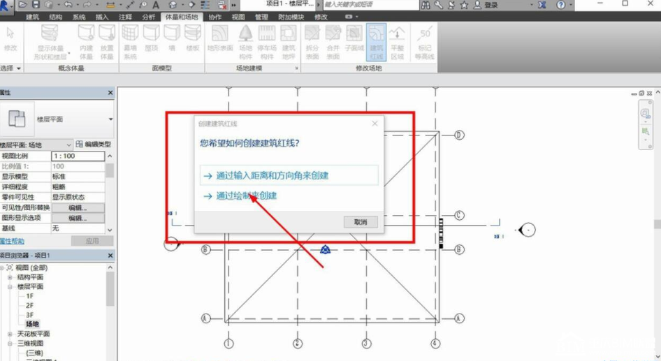 首先,我们开启Revit,在上方选项卡中点击体量和场地,在对应的选项卡菜单中,就以看到建筑红线的选项。