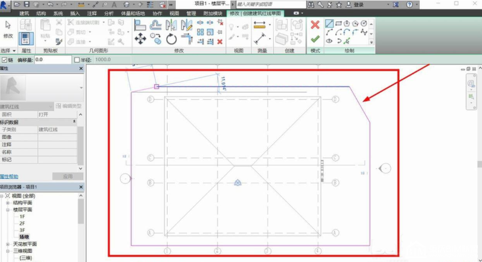 建筑红线完成绘制后,会在全部的平面图中出现,任何层数的平面图纸,都不能超越建筑红线。