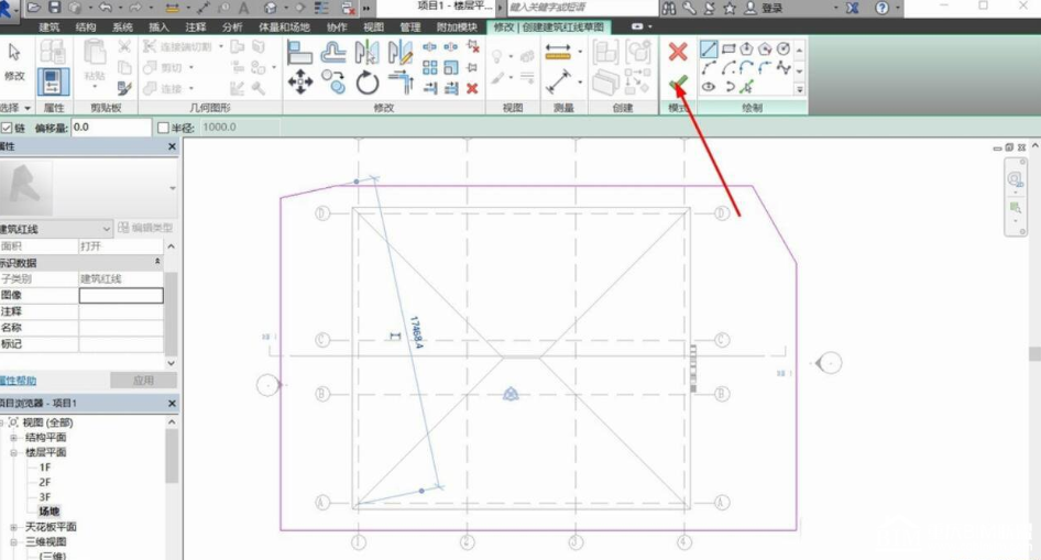 完成建筑红线的绘制后,我们就可以在上方窗口中点击对勾,系统就会自动完成建筑红线的绘制,并且生成建筑红线。