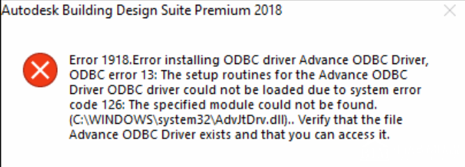 错误1918:安装ODBC驱动程序Advance ODBC驱动程序时出错,ODBC错误13:由于系统错误代码126,无法加载Advance ODBC驱动程序的设置例程:找不到指定的模块。C:WindowsSystem32AdvJtDrv.dll)。.确认Advance ODBC Driver文件存在,并且您可以访问该文件。
