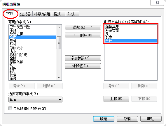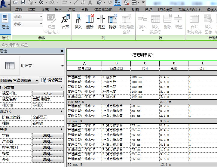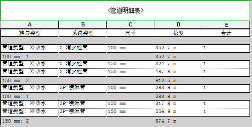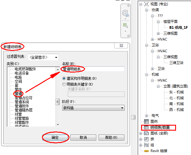 选择“明细表/数量”,单击右键选择“创建明细表/数量”,弹出“新建明细表”对话框,类别选择“管道”,点击“确定”,即创建出管道明细表,如图所示。