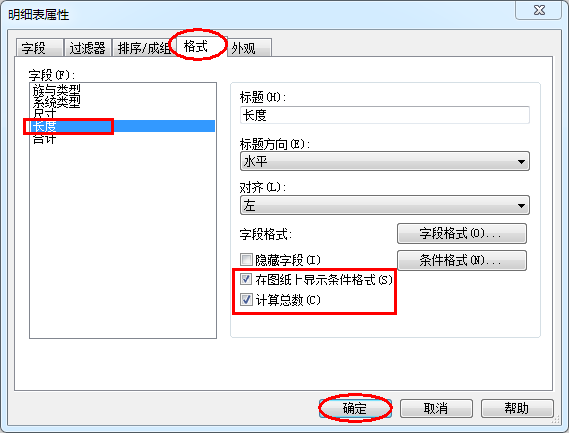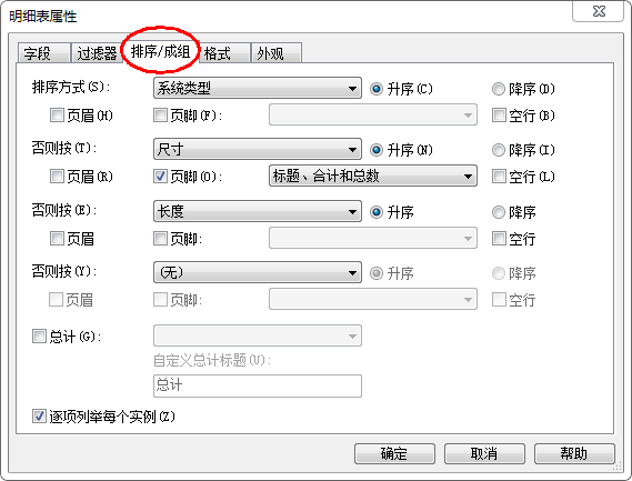 在“明细表属性”对话框中设置要求的“字段”、“排序/成组”和“格式”,如图所示。