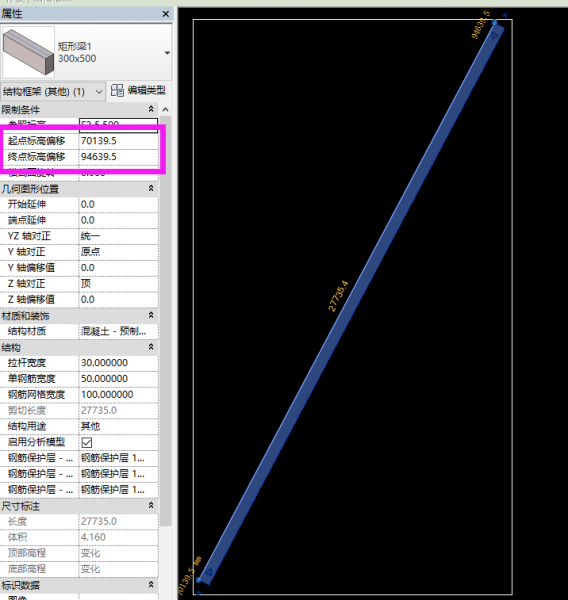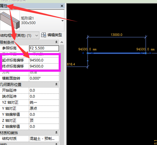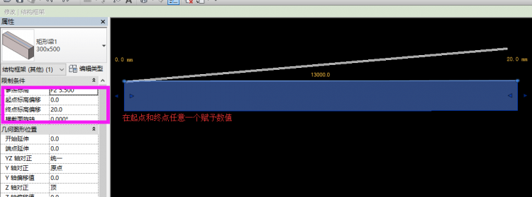 1、绘制一根梁,选择梁就会出现梁属性对话框,在属性对话框中有一个限制条件对话栏就可以设置梁的标高和起终标高以及截面旋转角度。梁的两端高差属性调整,通过起点和终点来调整,如图所示。