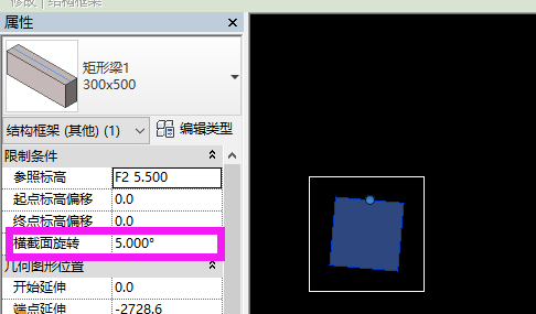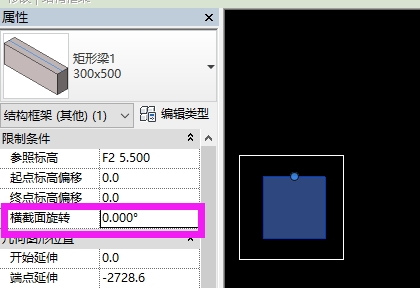 在项目中梁可能会出现截面有旋转角度或是需要旋转角度,这个就直接点选梁图元,弹出属性对话框,在限制条件有一个横截面旋转角度调整,如图所示。