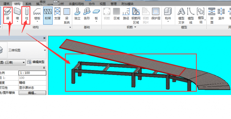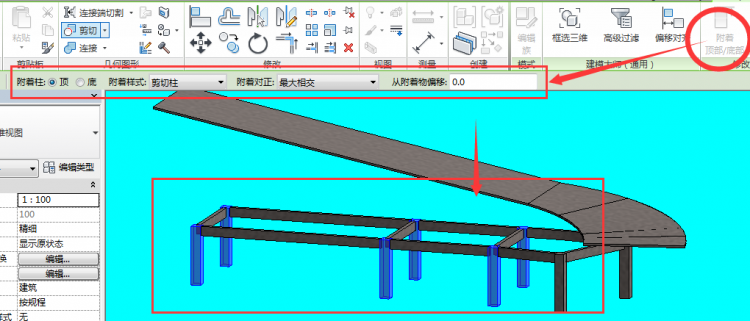 要画一个弧形的汽车坡道,它下面有结构柱和梁,那么如何让梁、柱跟随坡道的标高走呢?