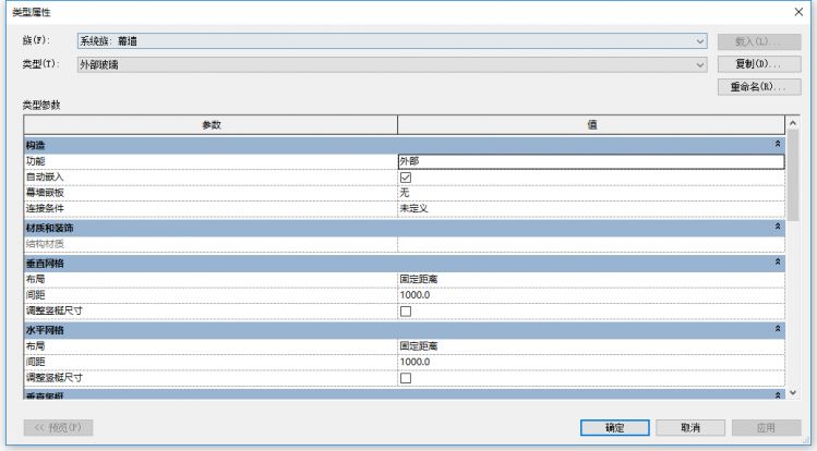 1、首先新建一个项目,绘制一个幕墙,属性类型如图所示。