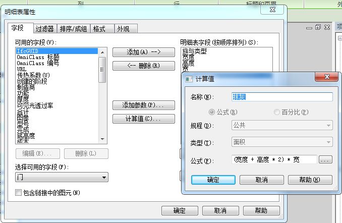 2、将修改完成的门族重新载入项目中,并新建明细表,选择门添加需要的字段,必须包括族与类型、宽、高度、宽度,最后选择计算值输入面积公式(即代表计算抹灰工程量的公式),如图所示。