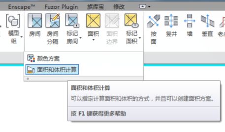 2、在“建筑”选项卡下的“房间和面积”下拉选项卡中点击“面积和体积计算”命令,如图所示。