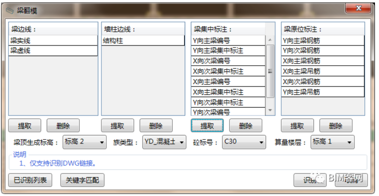 一、按图纸图层识别梁构件及其对应标高、砼标号等项目特征信息;
