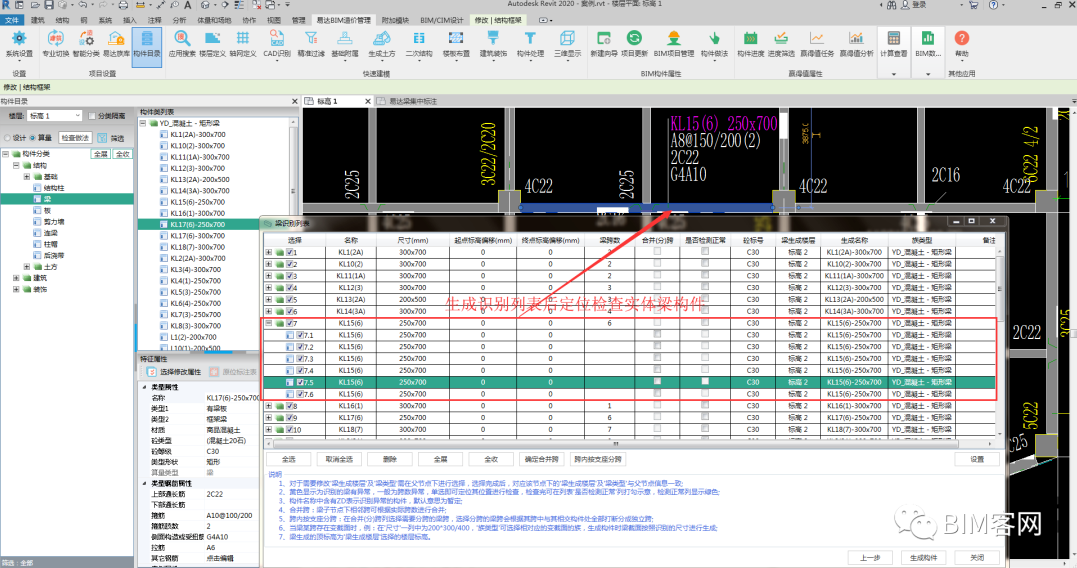 二、提取图层识别后,软件会自动按照梁的原位标注生成梁实例列表及梁识别列表,可根据识别列表进行梁的定位及跨数检查,检查完即可选择本梁生成构件;
