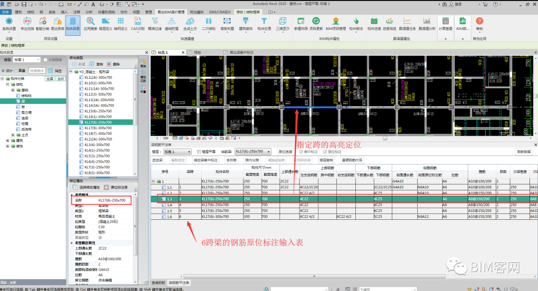 三、生成实体梁构件后,打开梁原位标注表即可对梁原位标注信息进行定位检查,或者手动修改,其截面大小、跨数、钢筋信息等均可手动写入;
