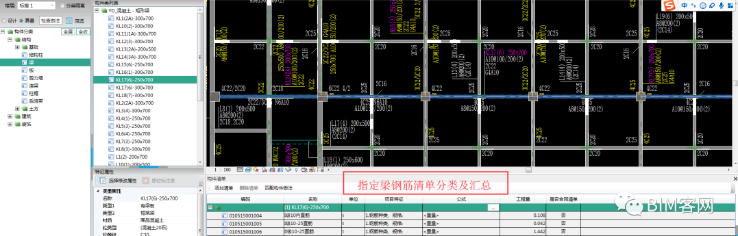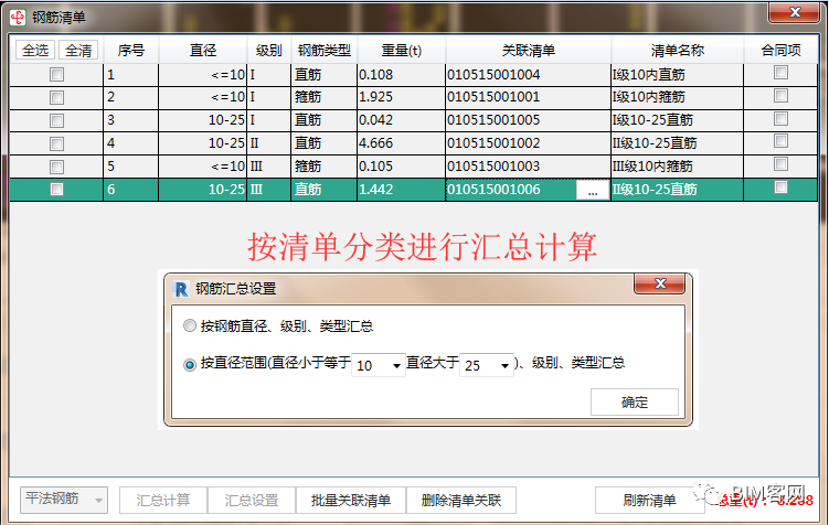 五、钢筋按照设置的直径范围及等级、类型进行汇总计算及清单做法关联;