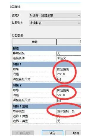 4、选择玻璃斜窗,将网格改为固定距离,网格1间距改为200,网格2改为500,网格1竖梃“内部类型”改为刚才创建的瓦。
