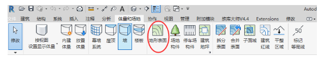 (2)单击“体量和场地”选项卡“模型场地”面板(地形表面)。