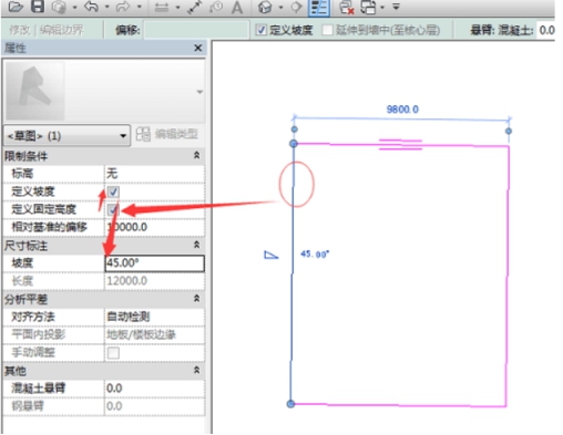 2)勾选定义固定高度,再勾选“定义坡度”,最后在尺寸标注栏的“坡度”中输入坡度值(可在CAD图中查找或自己计算)。然后点击“完成绘制”按钮即可完成斜板的绘制。
