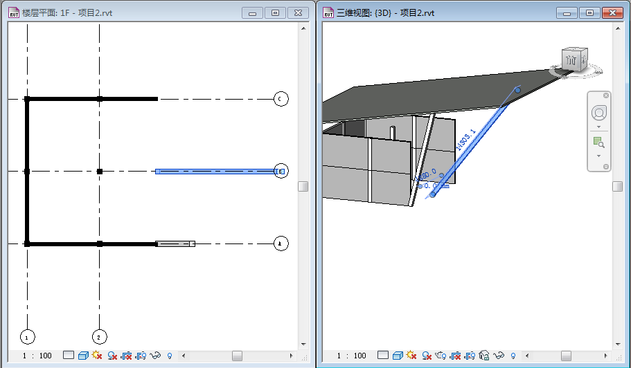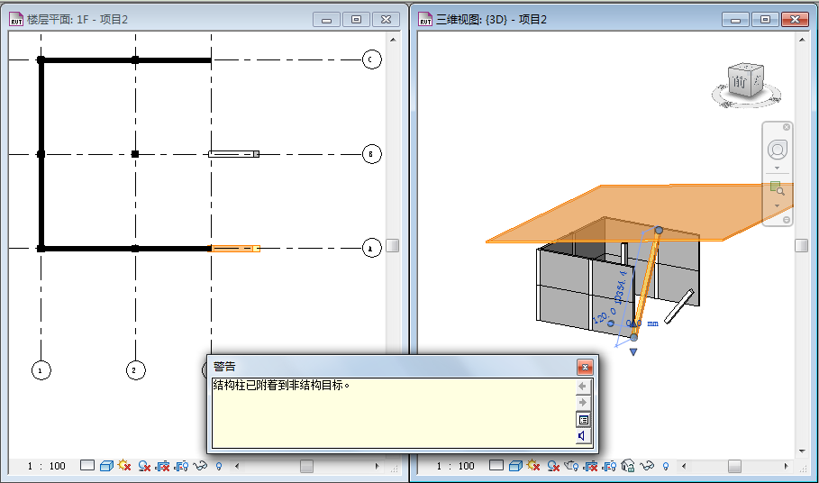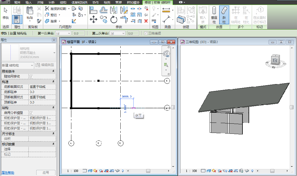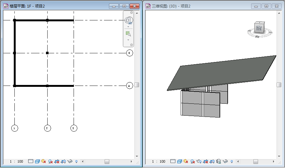 如图-1所示,我们现在简易搭建了一个模型,我们知道斜柱A在1F平面中在轴网A与轴网3交点上,在2F平面中在轴网A与轴网3右侧3000的交点上,这时我们怎么绘制斜柱A呢?