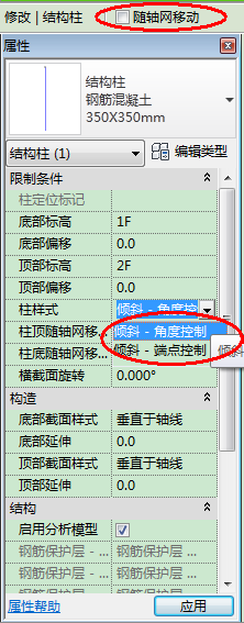 这时我们会发现柱子的斜度发生了改变,并没有达到我们需要的设计。此时我们选择斜柱B,然后在斜柱B的属性对话框中将 柱样式:倾斜-端点控制 更改为 倾斜-角度控制。并且在上下文选项卡中取消勾选 随轴网移动 如图-4