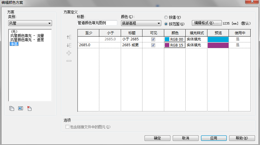点击确定,选中图例后点选功能区中的“编辑方案”,复制一个颜色方案,重命名为“净高检查”,并按(图-4)所示设置: