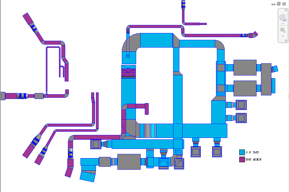 本例中满足净高要求的风管显示为紫红色,不满足的显示为蓝色。