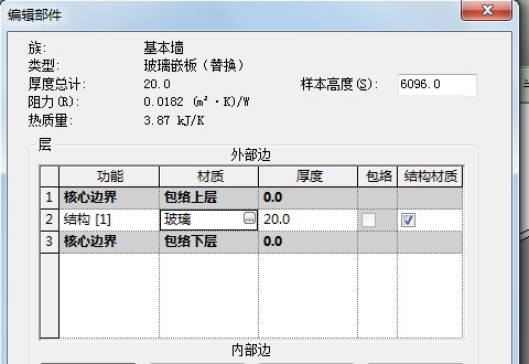 编辑替换的墙体嵌板,将其属性调整为玻璃,同时厚度调整为与其他嵌板玻璃一样,点击确定(如图)。