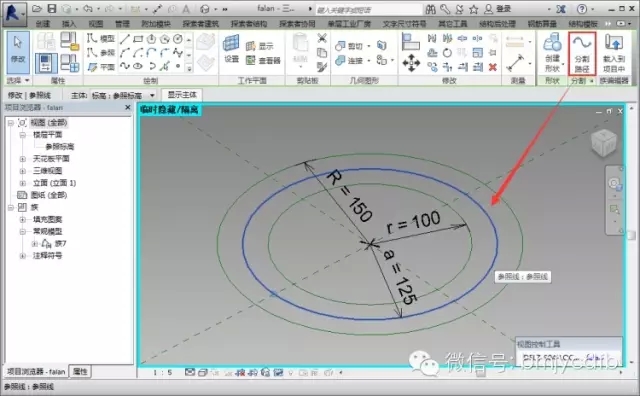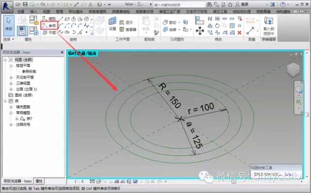 1、新建自适应公制常规模型或者概念体量族(建议常规模型,因为体量族的类型归类不能改),用参照线绘制三个同心圆,标注半径,附上类型参数,如下:
