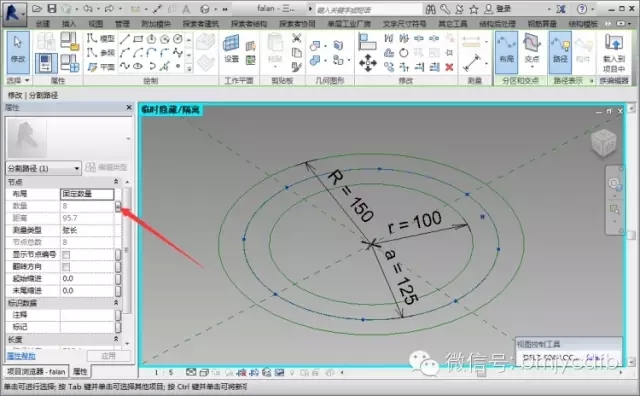 2、选取中间圆,分隔路径,在属性栏/节点/数量栏目附上个数参数,如下: