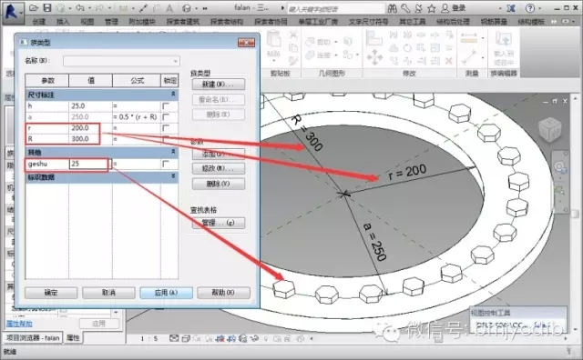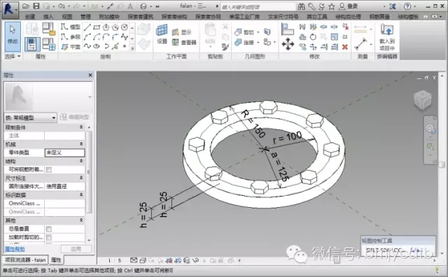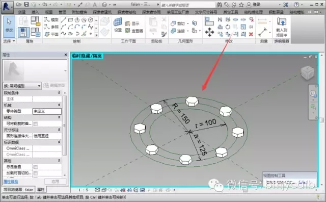 将上一步创建的螺栓载入到最先开始的圆中,在中间圆的参照点上放置一个,然后使用重复命令,如下: