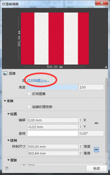 第一步将图象的源文件替换成上图中的红白贴图,第二步调整图像位置 ,使其红白左右放置,第三步调整贴图比例,这决定着每个红白条纹的长度 第四步 将水平和垂直重复都改成平铺。第五步将材质赋予给对象即可完成