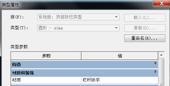 第五步 添加顶部扶栏材质,配合键盘Tab键。选中顶部扶栏。单击编辑类型按钮。打开类型属性对话框。在对话框中添加材质也为“栏杆扶手”。
