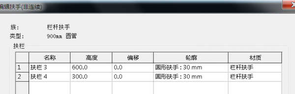 第二步 在中绘制出栏杆扶手3m,选中栏杆扶手,单击“编辑类型”按钮,打开“类型属性”对话框。在该对话框中单击栏杆结构后面的“编辑”按钮。弹出“编辑扶手(非连续)”对话框。删除扶手1和扶手2。修改高度分别为300mm和600mm。不修改轮廓。