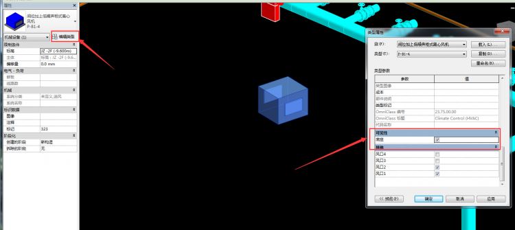 在Revit建模过程中,需要在模型中放置设备,例如风机,可以分为吊装式和落地式的,两者的区别在在于有无底座,这时就可以通过控制族中部分构件的显示情况来满足要求。