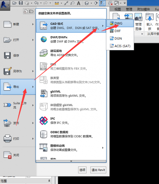 2、在弹出的下拉菜单栏中点击“导出”按钮,再在弹出的菜单栏中选择“CAD格式”点击后,弹出另外一个子菜单栏中点击“DWG”按钮,如图所示。