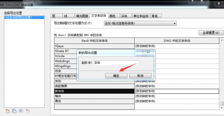 5、在弹出的新的导出设置对话框中“名称”设置成“字体”(可以随意设置自己易记住的名称)后,点击“确定”按钮,如图所示。