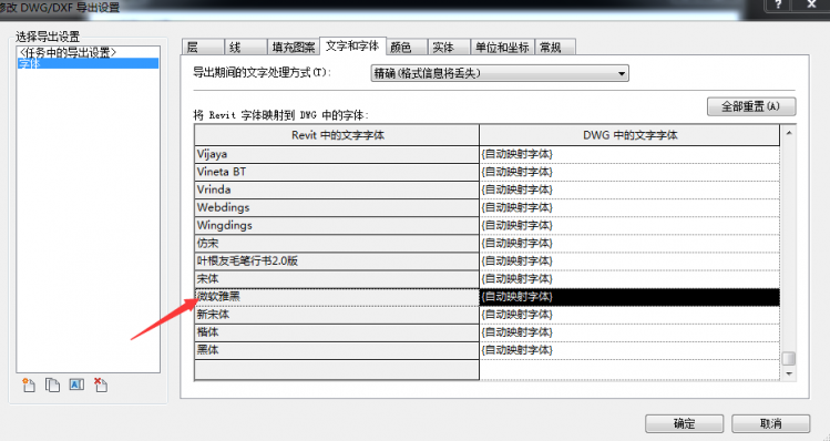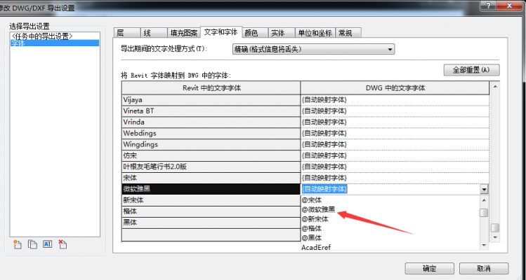 8、在对应的“DWG中的文字字体”中的“自动映射字体”点击下拉列表按钮。在列表中点击“微软雅黑”按钮,如图所示。