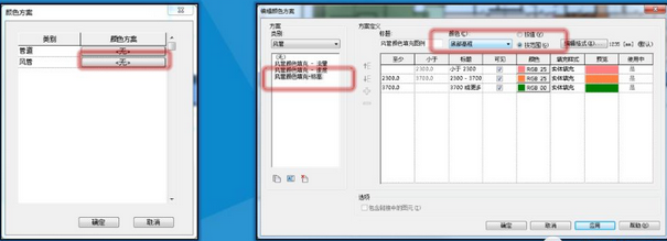 在方案定义对话框中的颜色选项卡可选用风管所有的实例参数,选择底部高程。点击按范围设置颜色,然后按照需求设置高度范围和颜色填充。