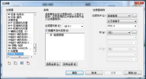 桥架设置时,可采用过滤器的方式进行设置,然后在过滤器中对应风管水管标高进行同色填充。
