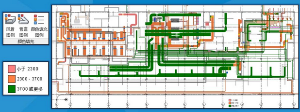 在分析选项卡中,点击“风管图例”即可按设置高度添加填充颜色。结果如下: