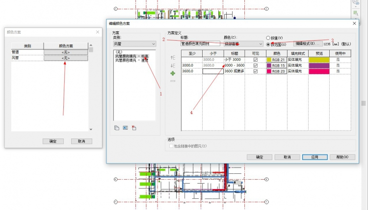 2、新建一个方案并命名为“风管颜色填充-标高”,在方案定义中的颜色选项卡选择“底部高程”,点选“按范围”,然后按要求设置高程范围和颜色填充,本例以3000mm为净高要求,梁底为3600mm,如图所示。