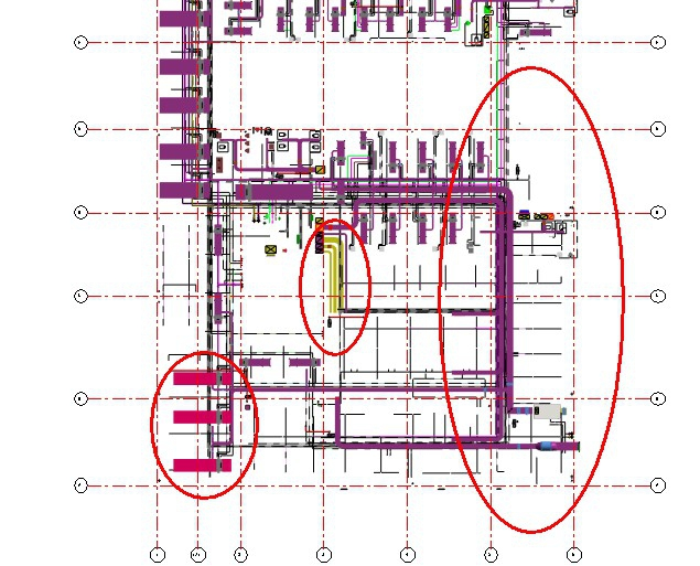 3、本例中满足净高要求的风管显示为紫色,低于净高要求的显示为黄色,高于梁底的显示为红色,如图所示。