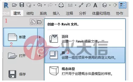 首先我们先绘制一个楼板边所需要的轮廓,点击软件左上角的文件选项卡,单击【新建】→【族】,如图: